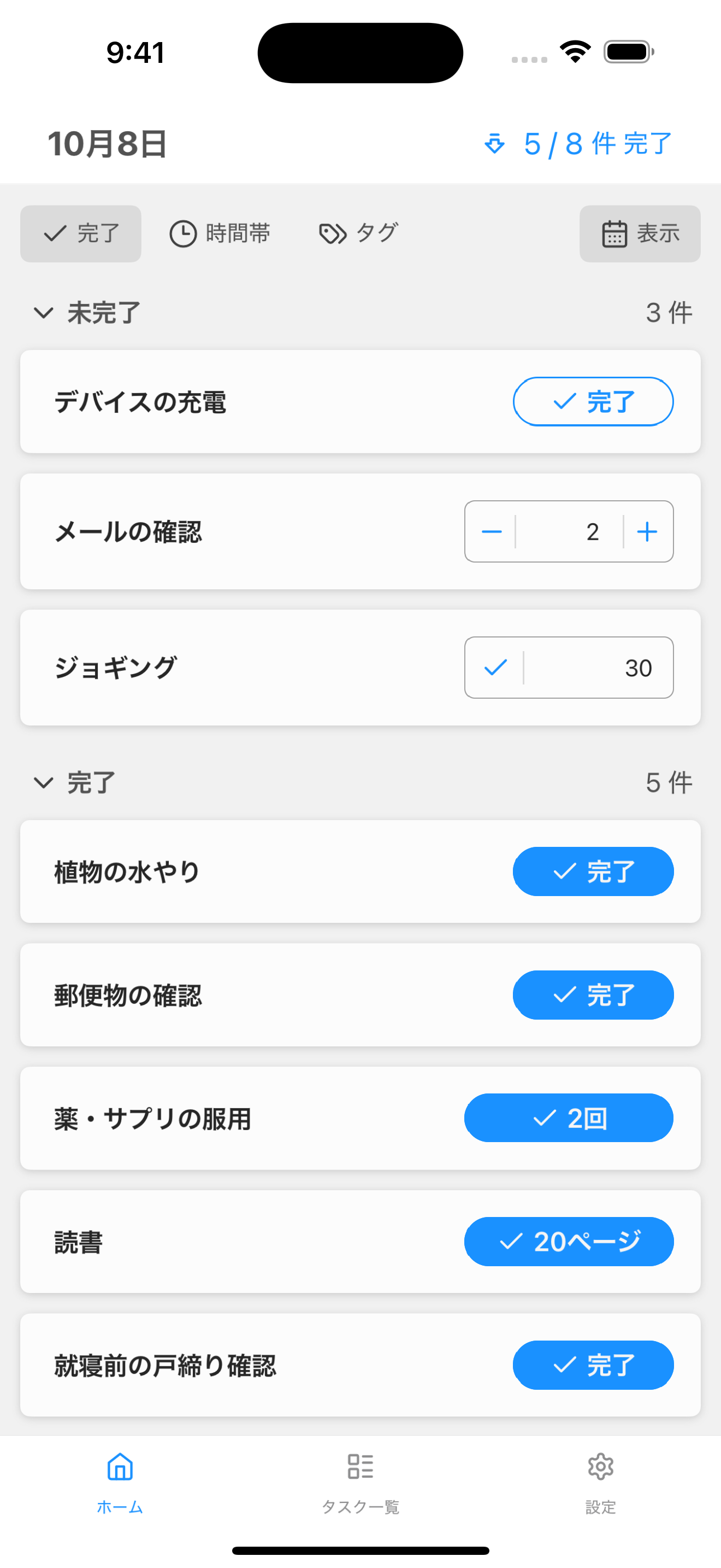 - 「ホーム画面」の右上のタスクの数 (「〇/︎〇件︎ 完了」の部分) をタップします。