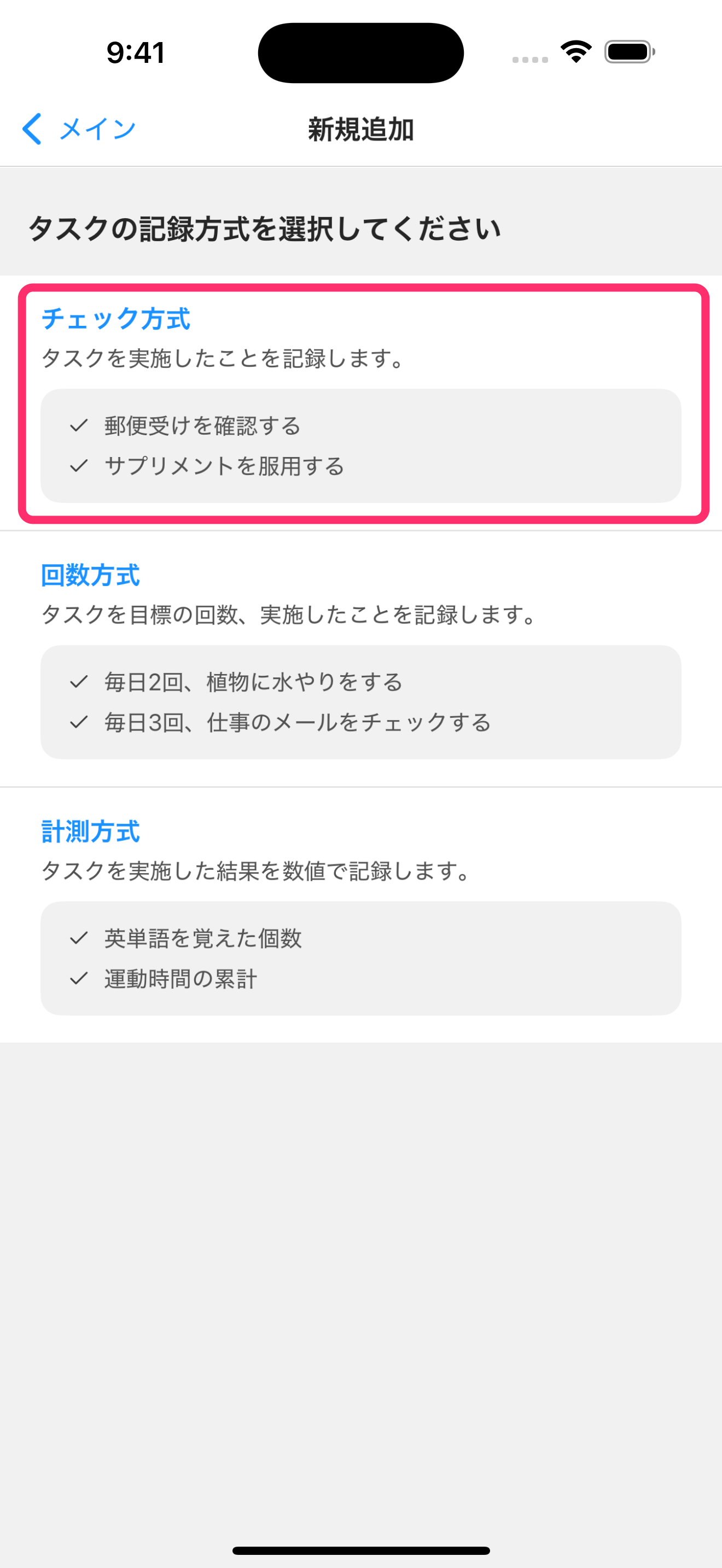 一日一回タスクを実施することができたか登録するために「チェック方式」を使用します。 アプリの使い方に慣れたら以下の方式も試してみてください。詳しくは「タスクの種類について」をご覧ください。