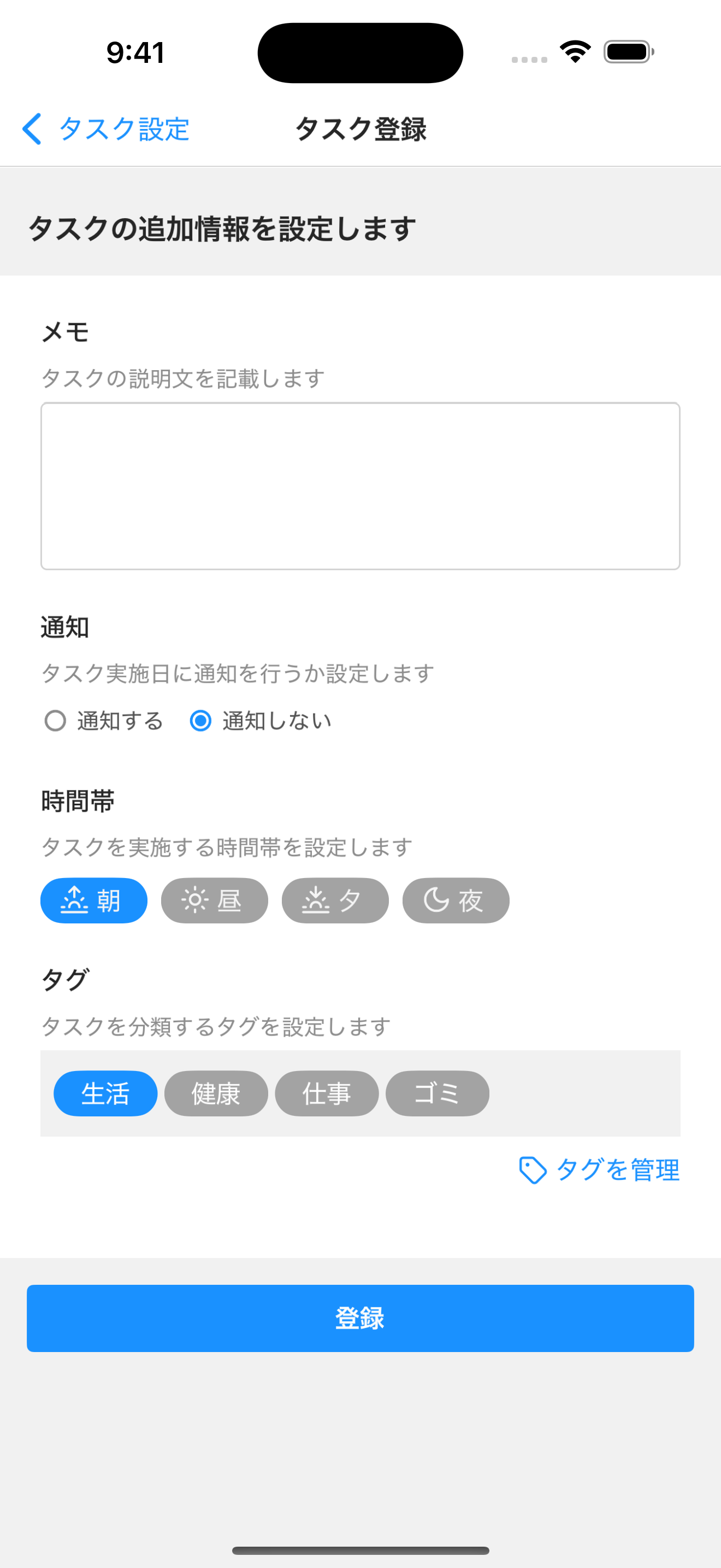 | 時間帯 | タスクを実施する時間帯を設定します。時間帯を設定すると、ホーム画面で時間帯ごとにタスクを分類することができます。詳しくは「時間帯とタグについて」をご覧ください。 |