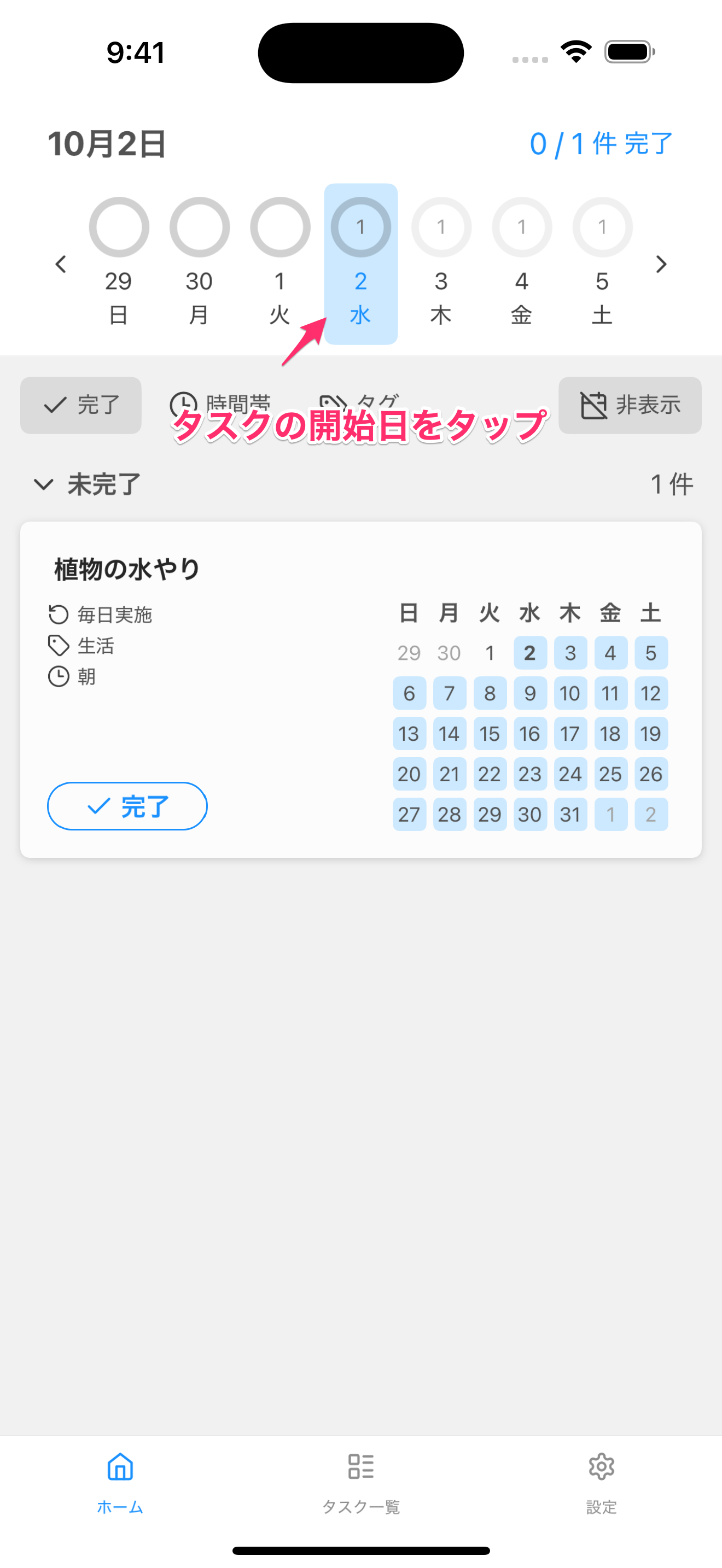 登録が終わるとホーム画面が表示されます。ホーム画面の上部にある「日付リスト」からタスクを実施する日付をタップして、タスクが登録されていることを確認してください。 日付リストの詳しい操作方法は「ホーム画面」をご覧ください。