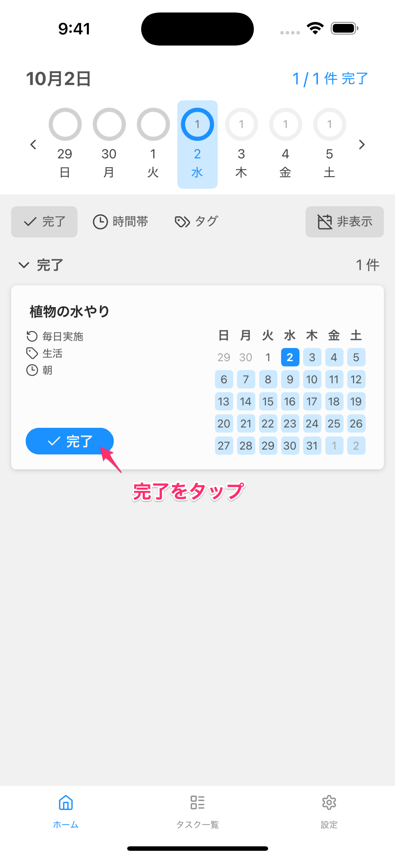 実際にタスクを実施したらホーム画面の「完了」ボタンをタップしてください、タスクが完了したことをアプリが記録します。 タスクが習慣化されるように毎日アプリに実績を登録しましょう!