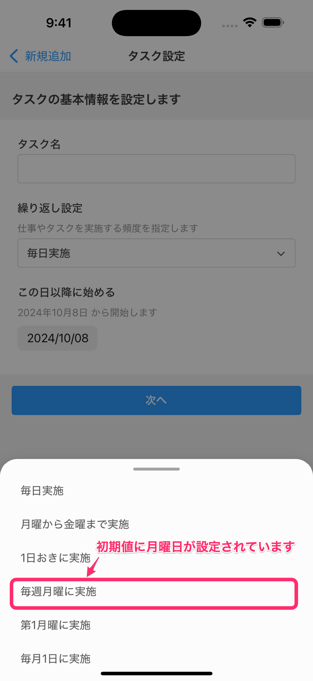 - 「毎週〇曜に実施」を選択します。初期値の「毎週月曜に実施」をタップします。