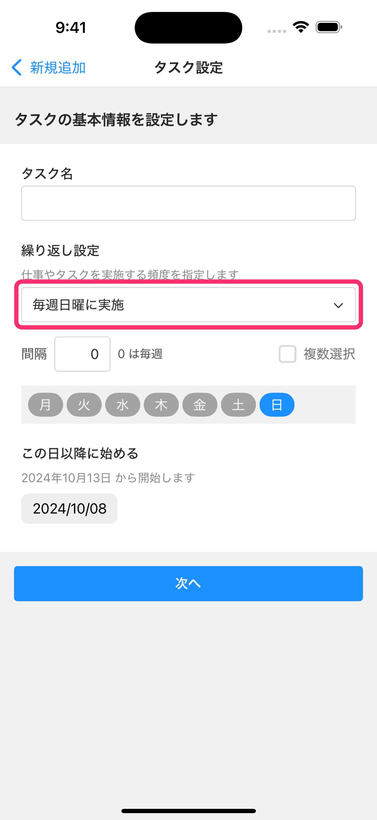 タスクの追加・編集時にタスクの繰り返し設定を選択する場合、「1日おきに実施」や「毎週月曜に実施」など初期値の設定で種類が表示されます。 使用したい種類を選択後、「3日おきに実施」や「毎週日曜に実施」など希望する設定を変更してください。