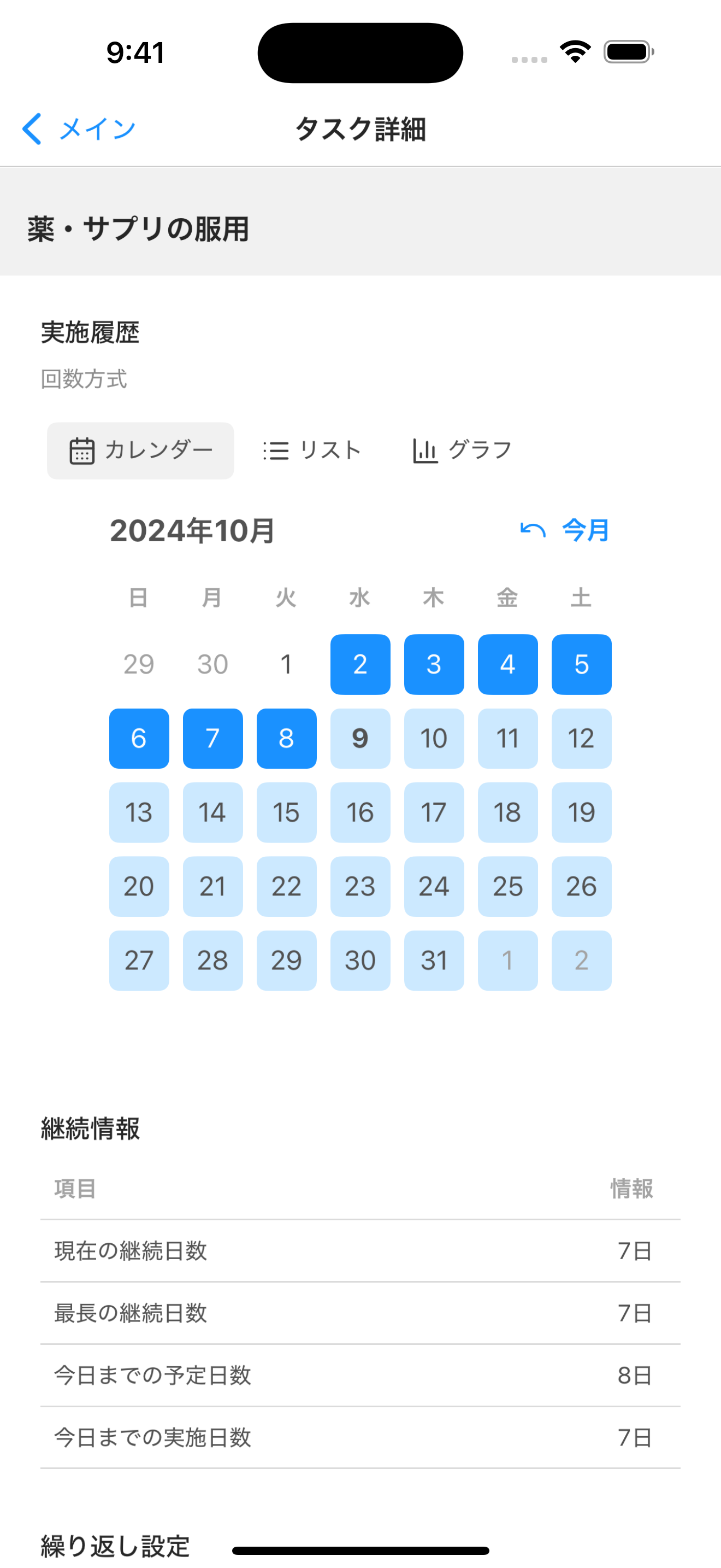 月ごとのタスクの実績を表示します。カレンダー・リスト・グラフのボタンをタップすると、実績の表示方法を変更します。