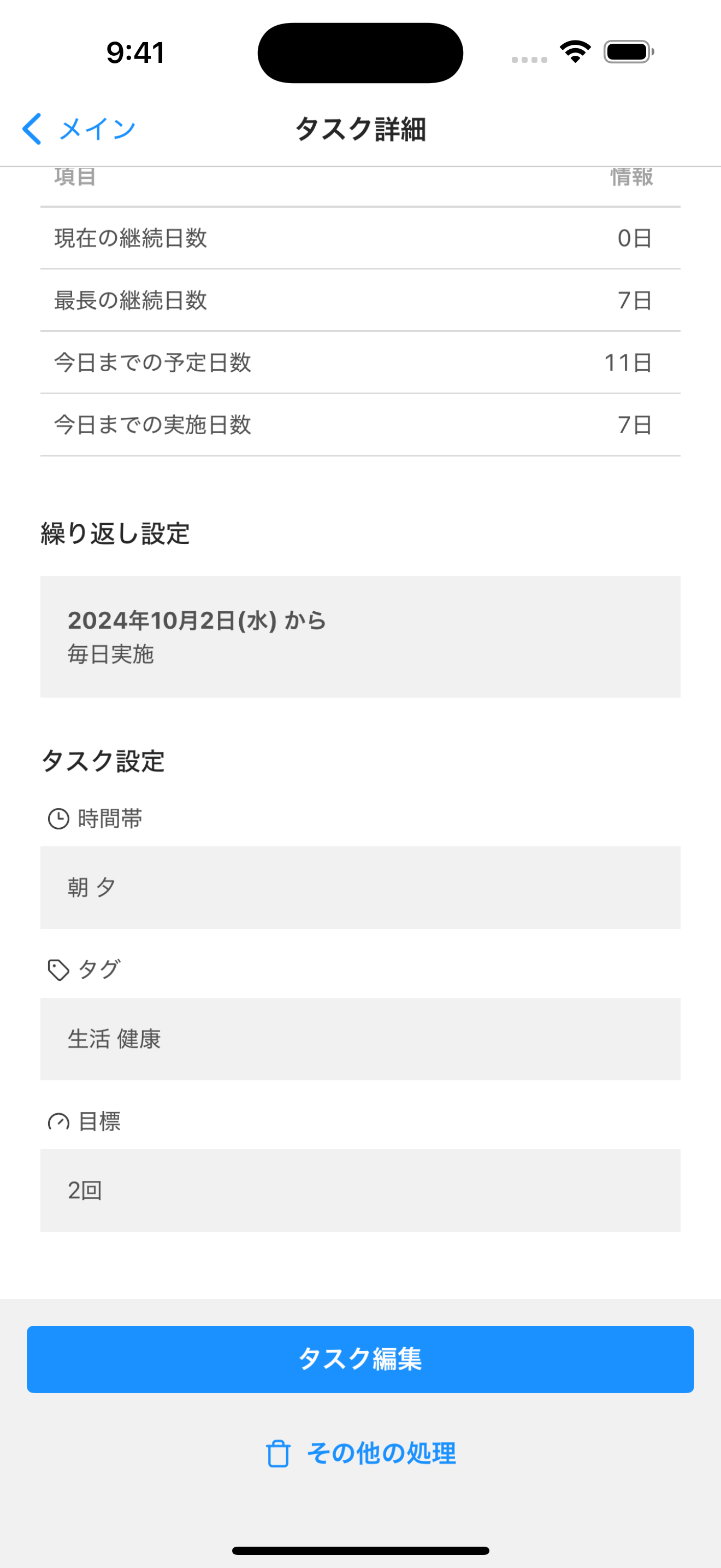 「タスク編集」ボタンをタップすると、「タスクの編集画面」を表示します。「タスク編集画面」からタスクの設定を変更することができます。