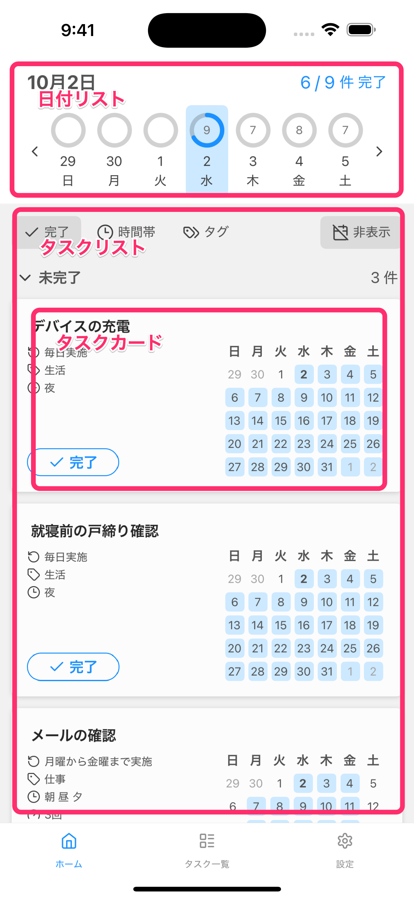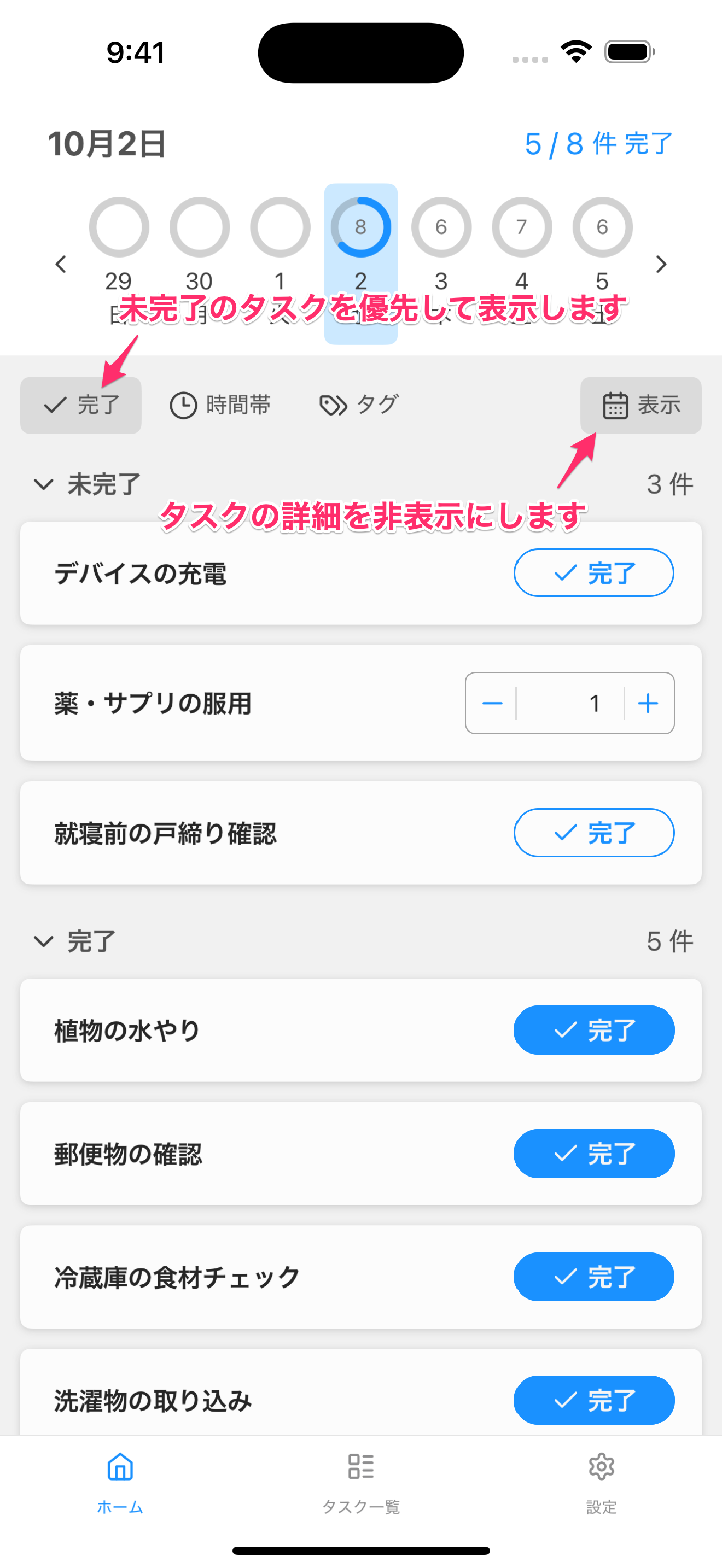 ホーム画面の構成と機能を説明します。ホーム画面ではその日実施するタスクを確認したり、実施したタスクの実績を登録することができます。