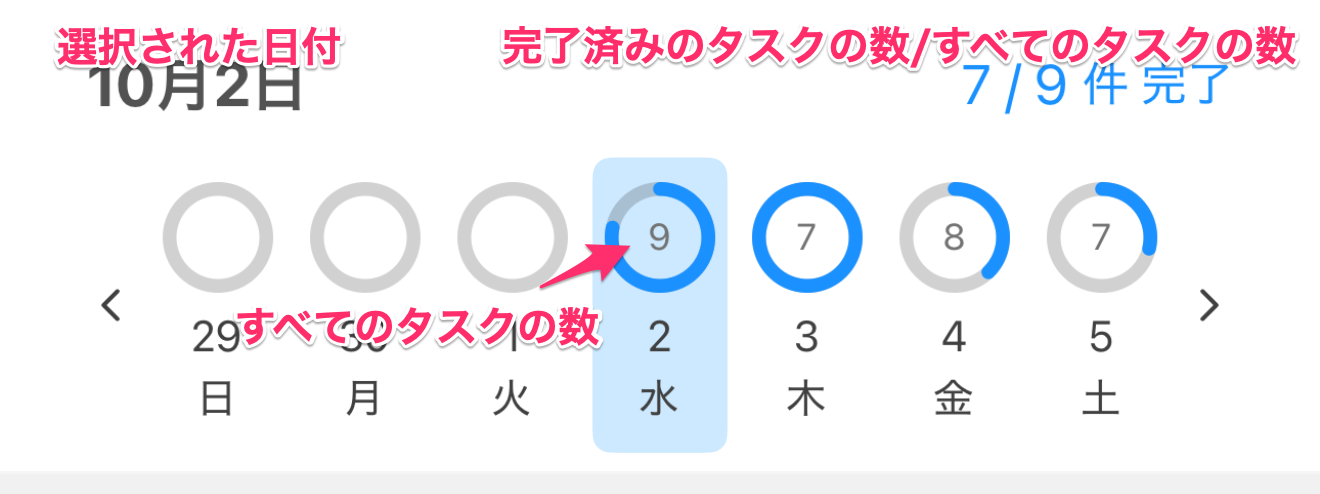一週間のそれぞれの曜日に実施するタスクの数を表示します。タスクの数の周りの輪は、タスクの進捗度を表しています。 選択された日付に実施するタスクの一覧を画面下の「タスクリスト」に表示します。日付リストを左右にスワイプすることで表示している週の前後の週を確認することができます。