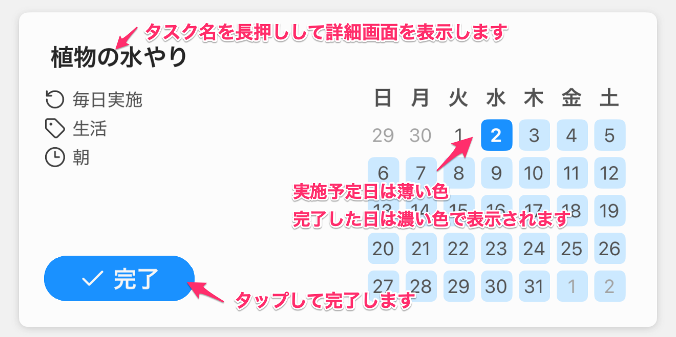 | チェック方式 | タスクを実施したときに完了ボタンをタップします。 完了状態でもう一度タップすると、実績が解除されます。 |