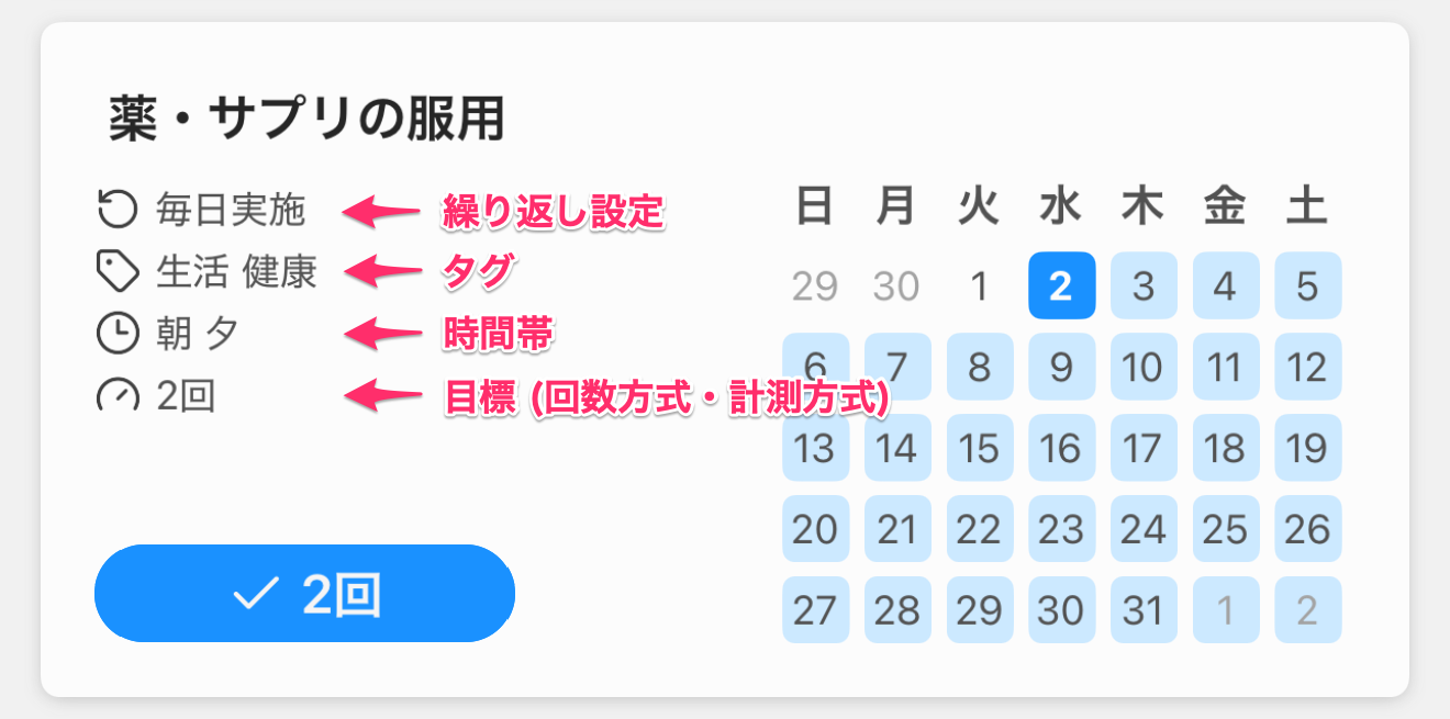 | 目標 | 記録方式が回数方式の場合、目標の回数。 計測方式で目標を設定した場合、目標値 |